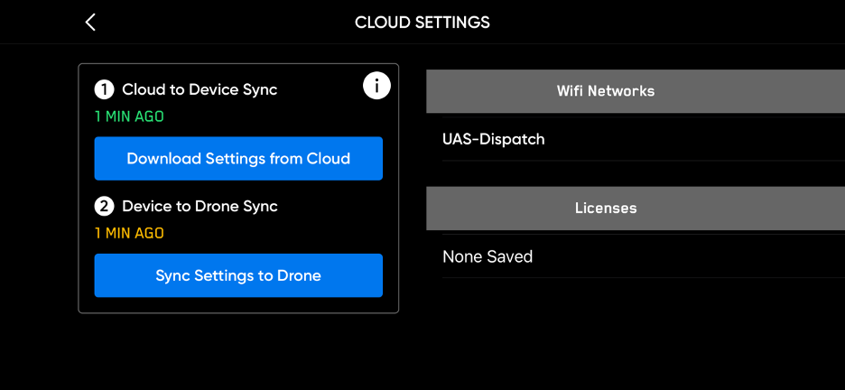 Power on the drone and connect to the drone with the controller On the home screen click on the info button on the top right corner of the screen Click on the drone you are connected to (should have a WIFI symbol next to the name if connected) On the list of options on the right side of the screen select “Cloud Settings” (may need to scroll down to find this option) Here is where the issue lies that under the licenses portion of the screen, not all the available/necessary licenses appear. This image displays that this drone has no applied licenses. (All 4 licenses are needed for fault code to resolve) Click on the blue button that says, “Download Settings from Cloud”. Wait 15 seconds and select the blue button that says, “Sync Setting to Drone” (The screen should display all 4 licenses) Power cycle the drone and close completely out of the Skydio Enterprise app. The drone is now ready to fly, and faults should be resolved. Troubleshooting